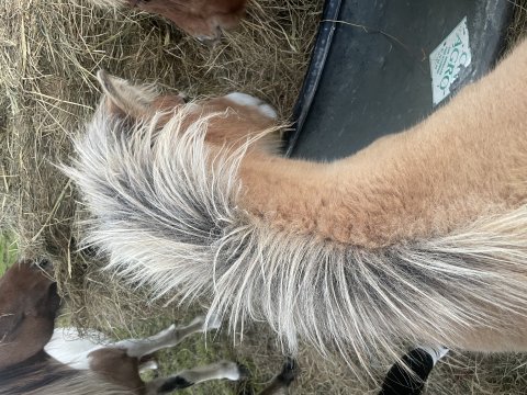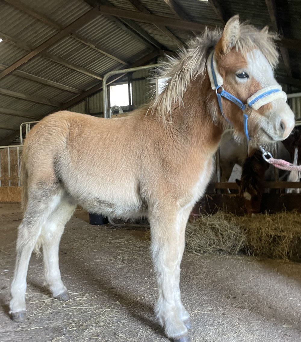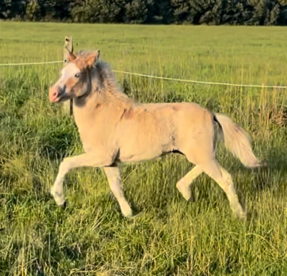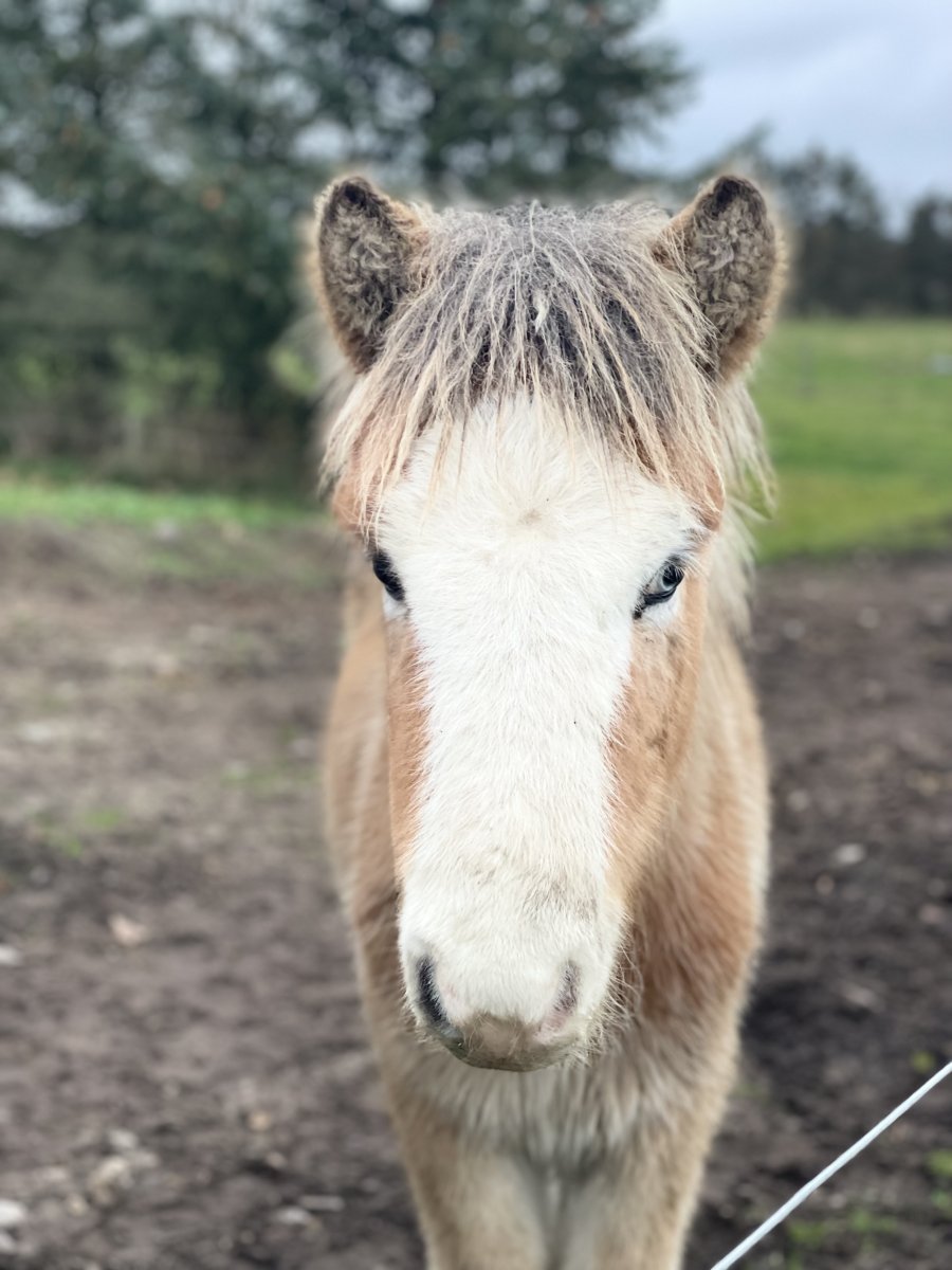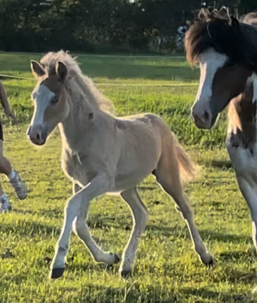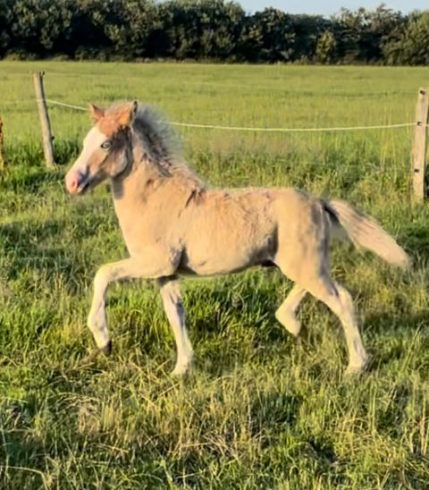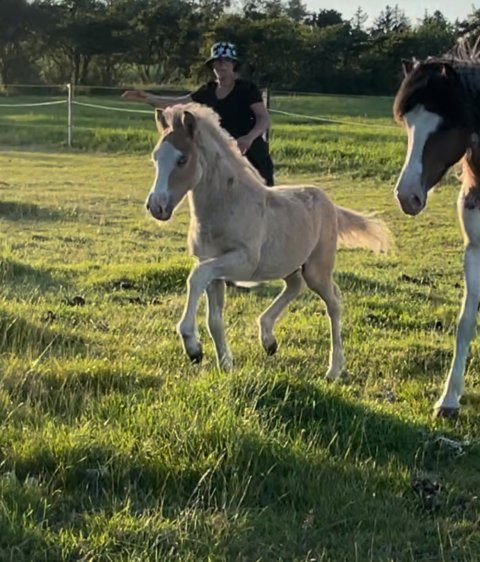 Lys Brun hingst med splash - et blåt øje - gråt hår
